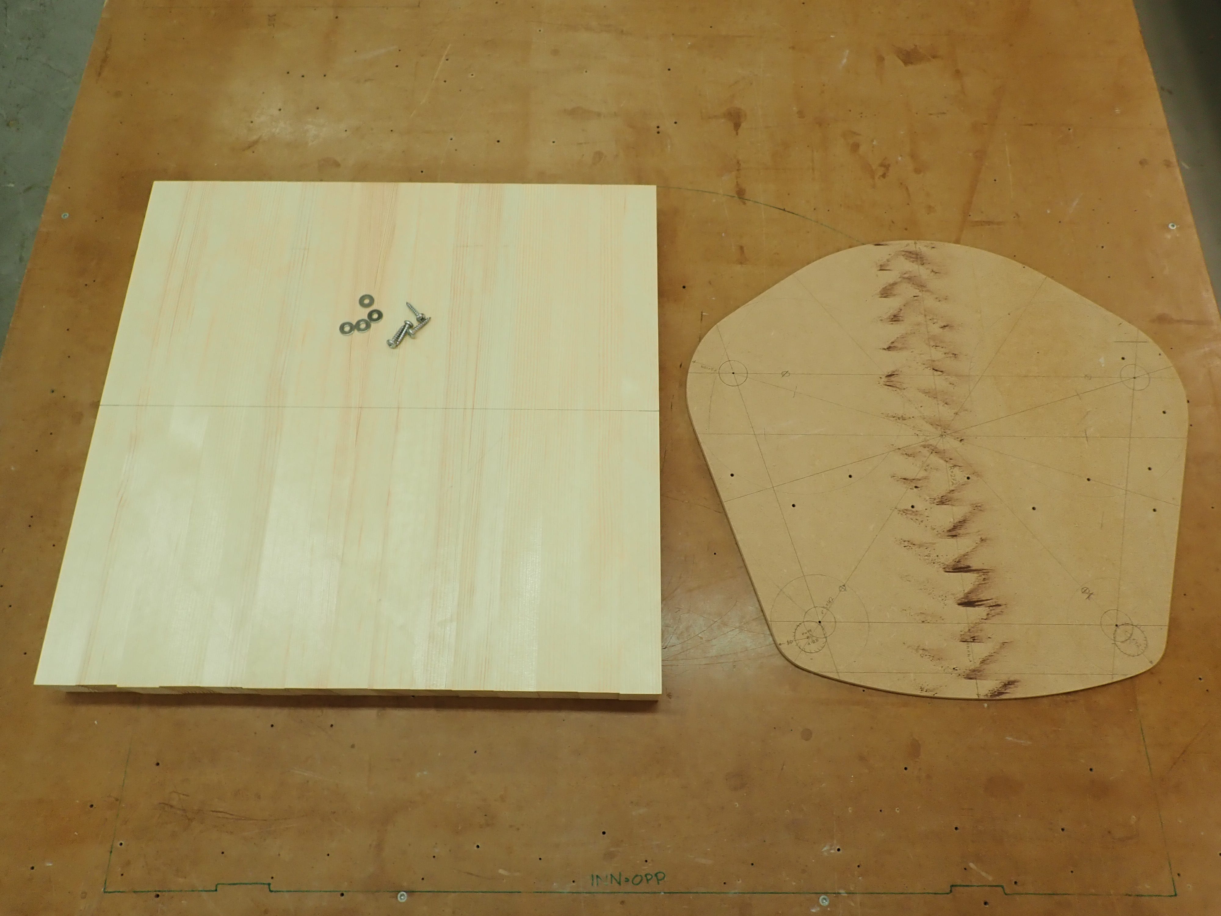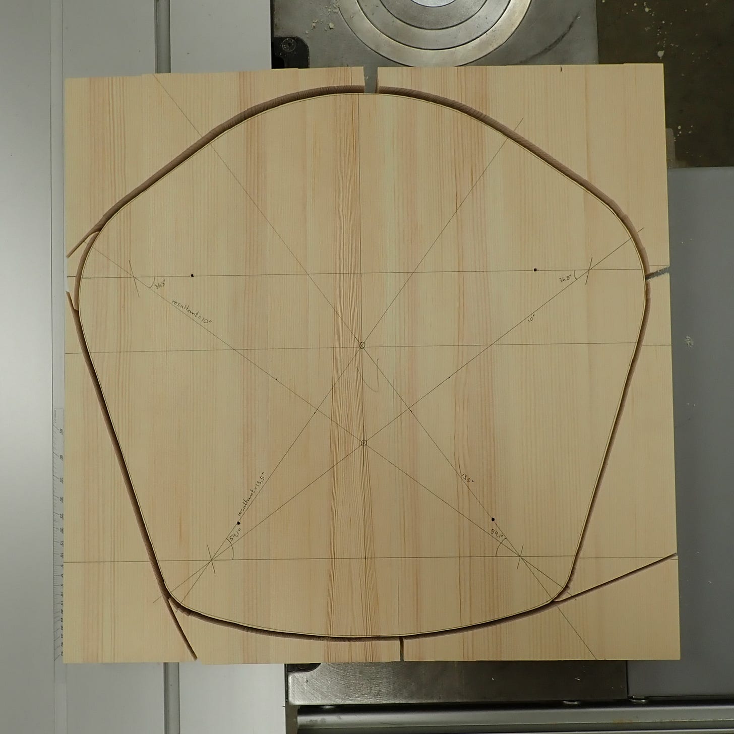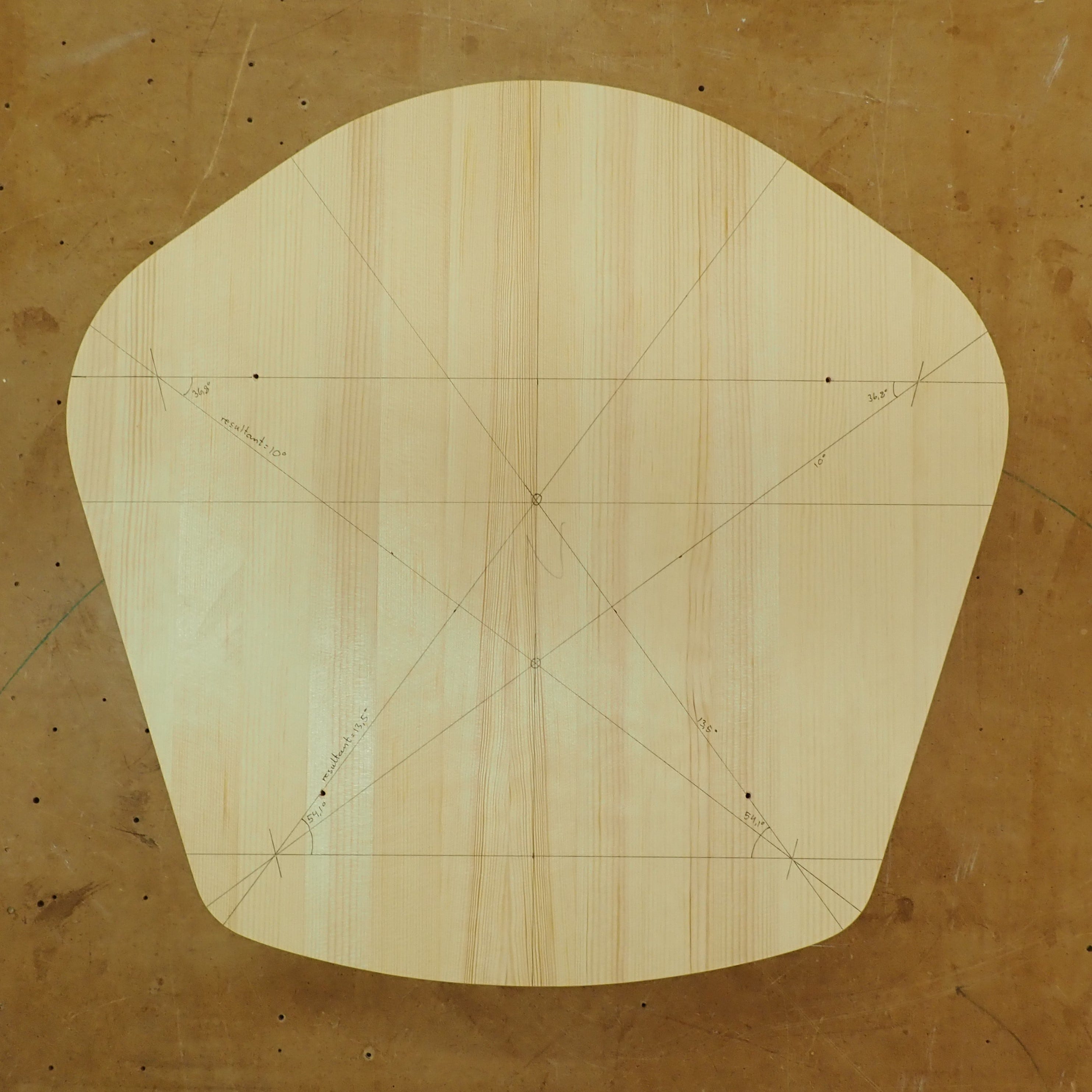 Then, I drew a seat shape based on the pentagon on a scrap of 6mm MDF.