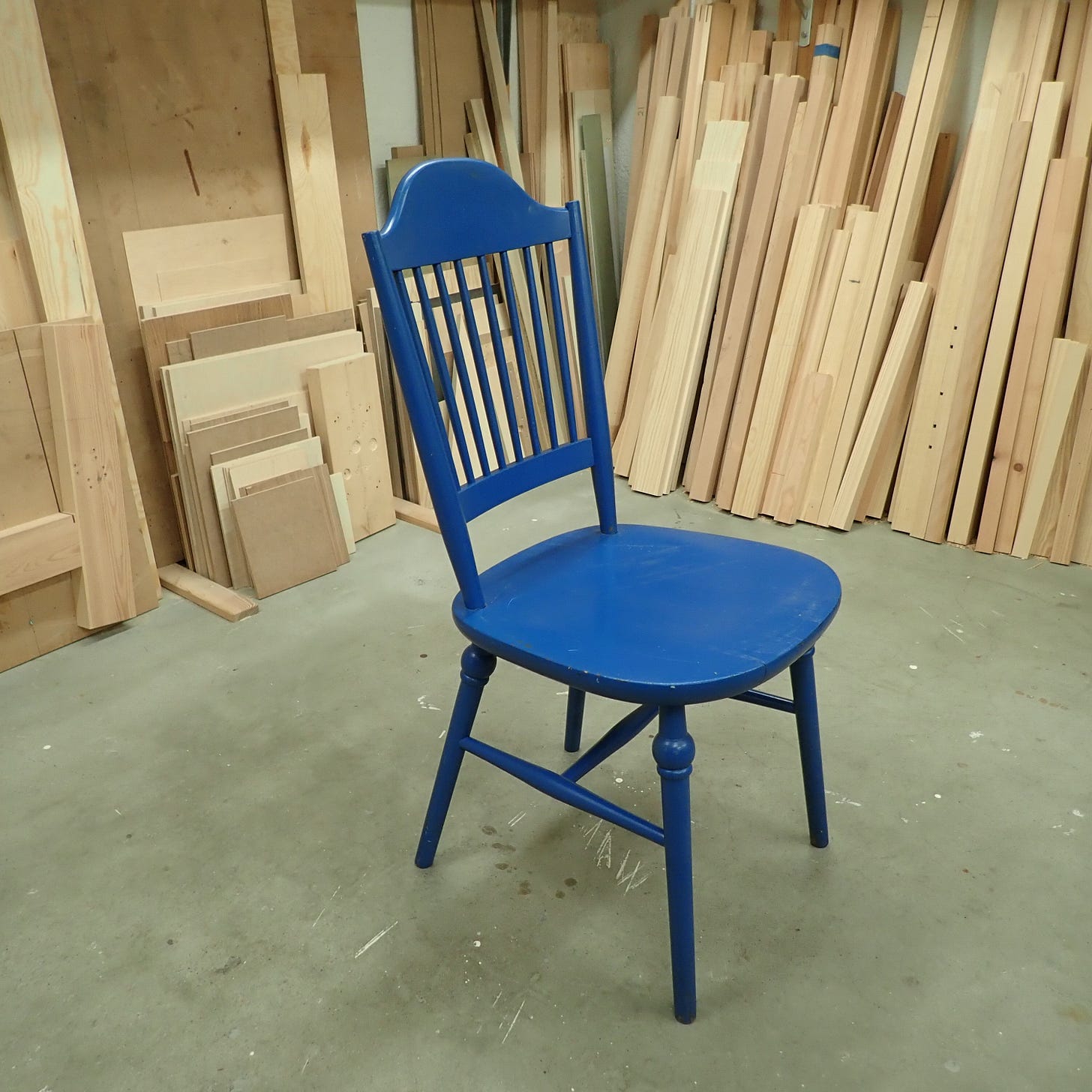 I have a pair of blue, Swedish stick-chairs that I rescued from a skip (dump-ster) ten years ago. I use one at my desk and the other in my bedroom.
