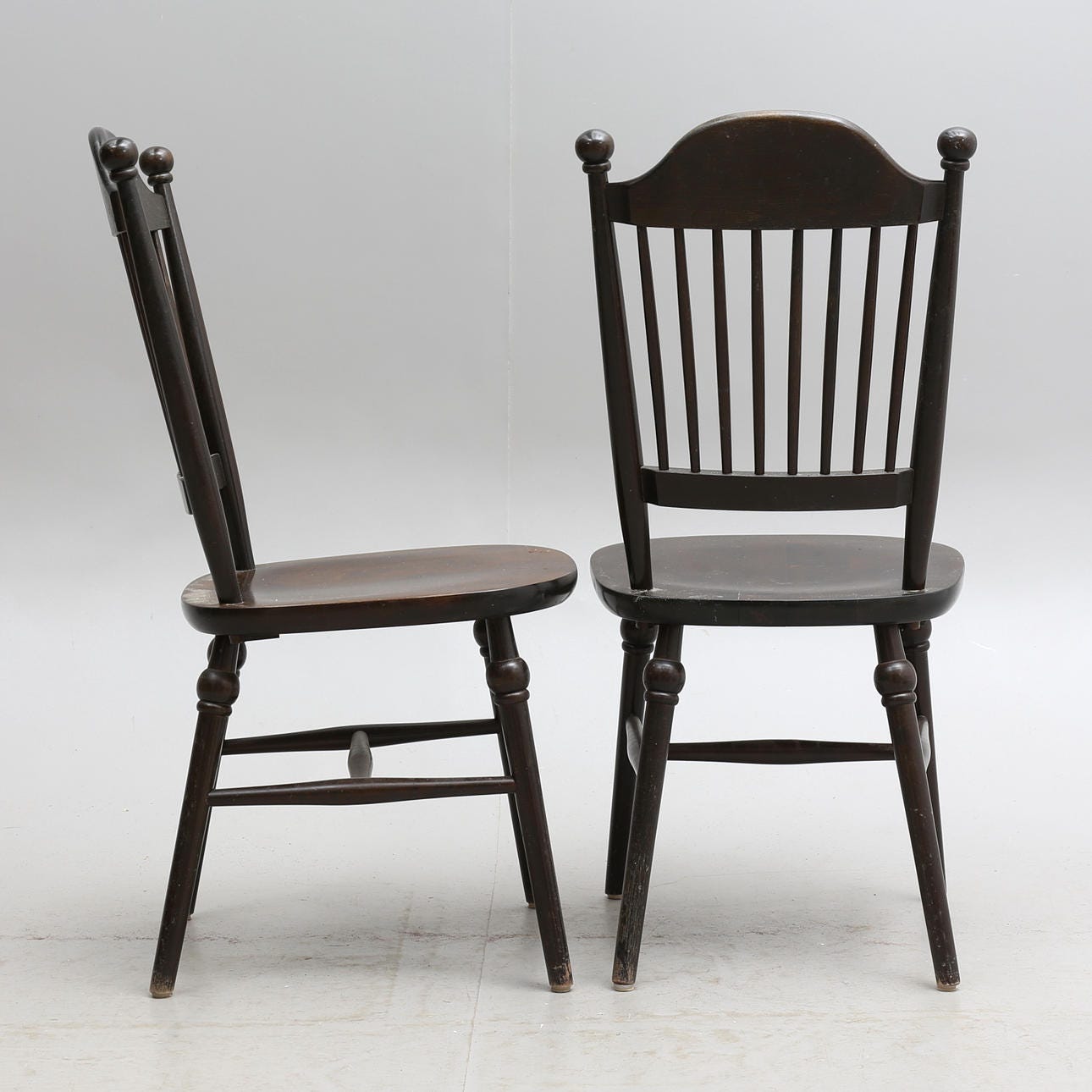 They’re made at Nässjö Stolfabrik and seem to originally have had turned finials atop of the backrest staves to match the knobs on the legs.