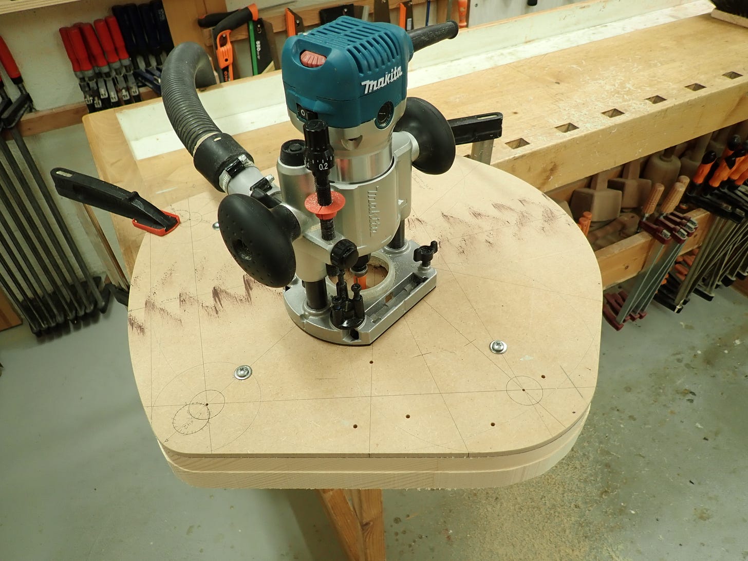 The MDF template serves several purposes: Firstly to mark the contour of the seat and the position of the leg-mortises.